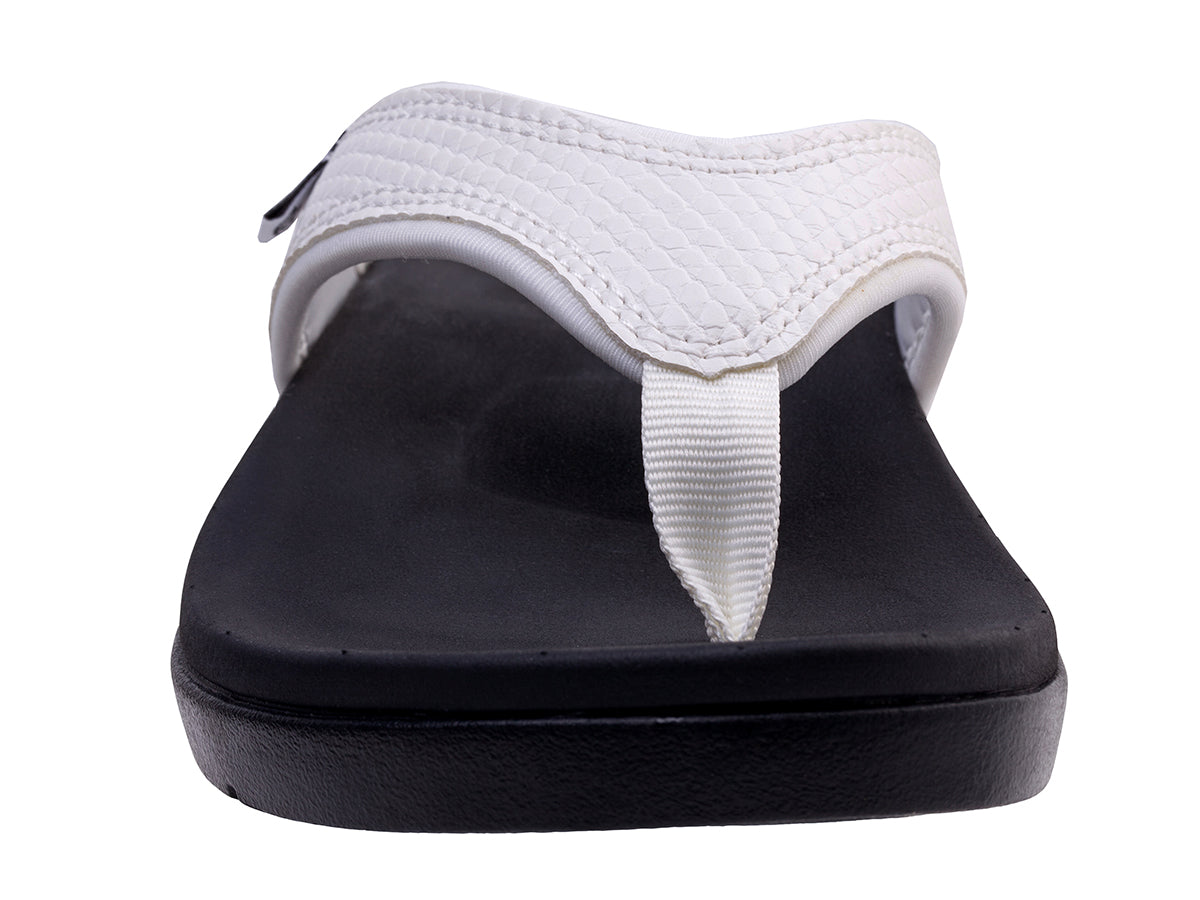 East or west, a shoreline never disappoints and with neither function nor fashion taking the back seat, the Shoreline Snake is no exception. Combining textured beach-friendly synthetic leather, a webbing toe-post, quick-dry linings, and an unlined footbed, make a statement this season by adding effortless flare to your attire. Our Full Contact Comfort® footbed provides an unmatched level of comfort and support.