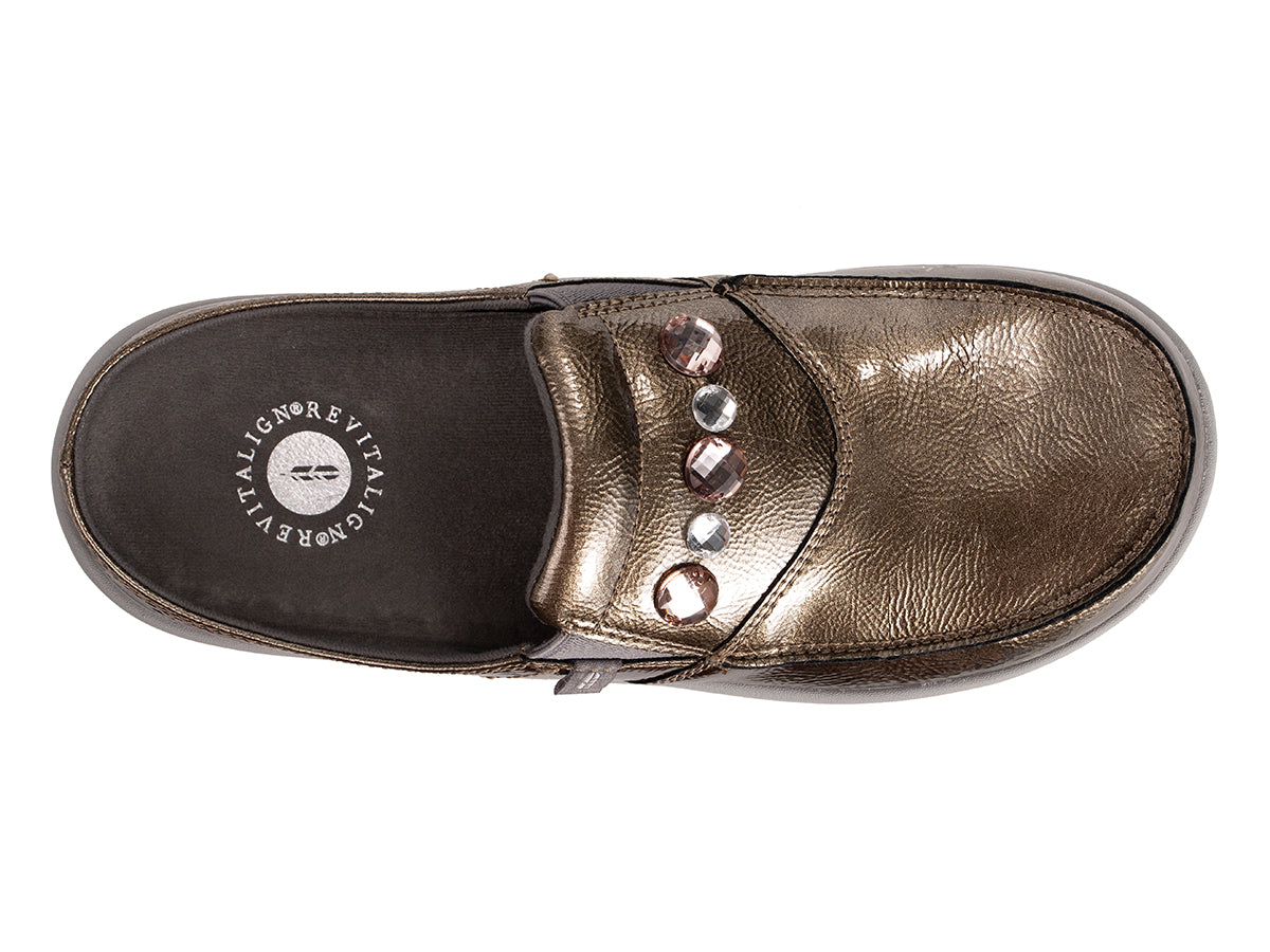 A glamorous touch to upgrade your everyday style with the Siesta Dazzle. Combining rich crinkle patent tones alongside bedazzled low-profile gems, staying on-trend this season just got a little easier and a whole lot more comfortable with Revitalign® Footwear and our Full Contact Comfort® Footbed, delivering an unmatched level of orthotic support for years to come.