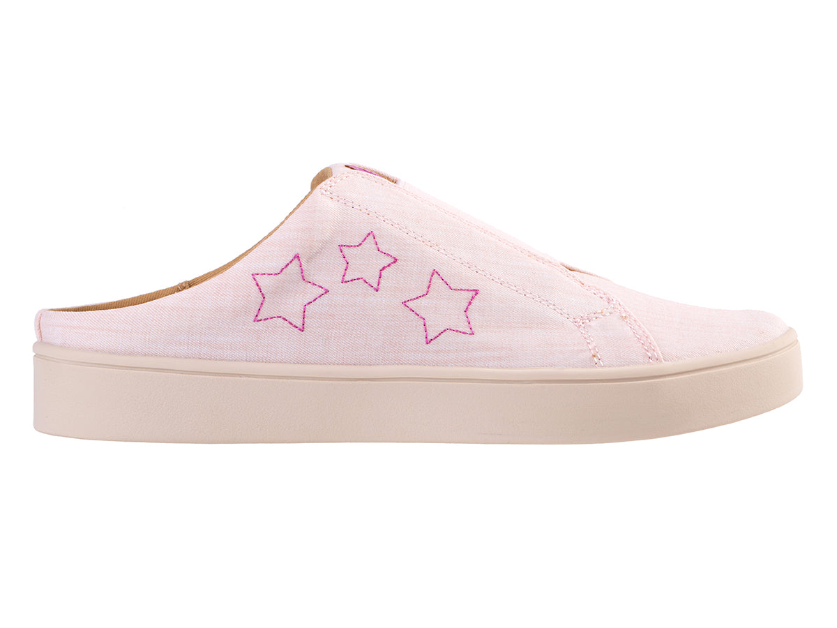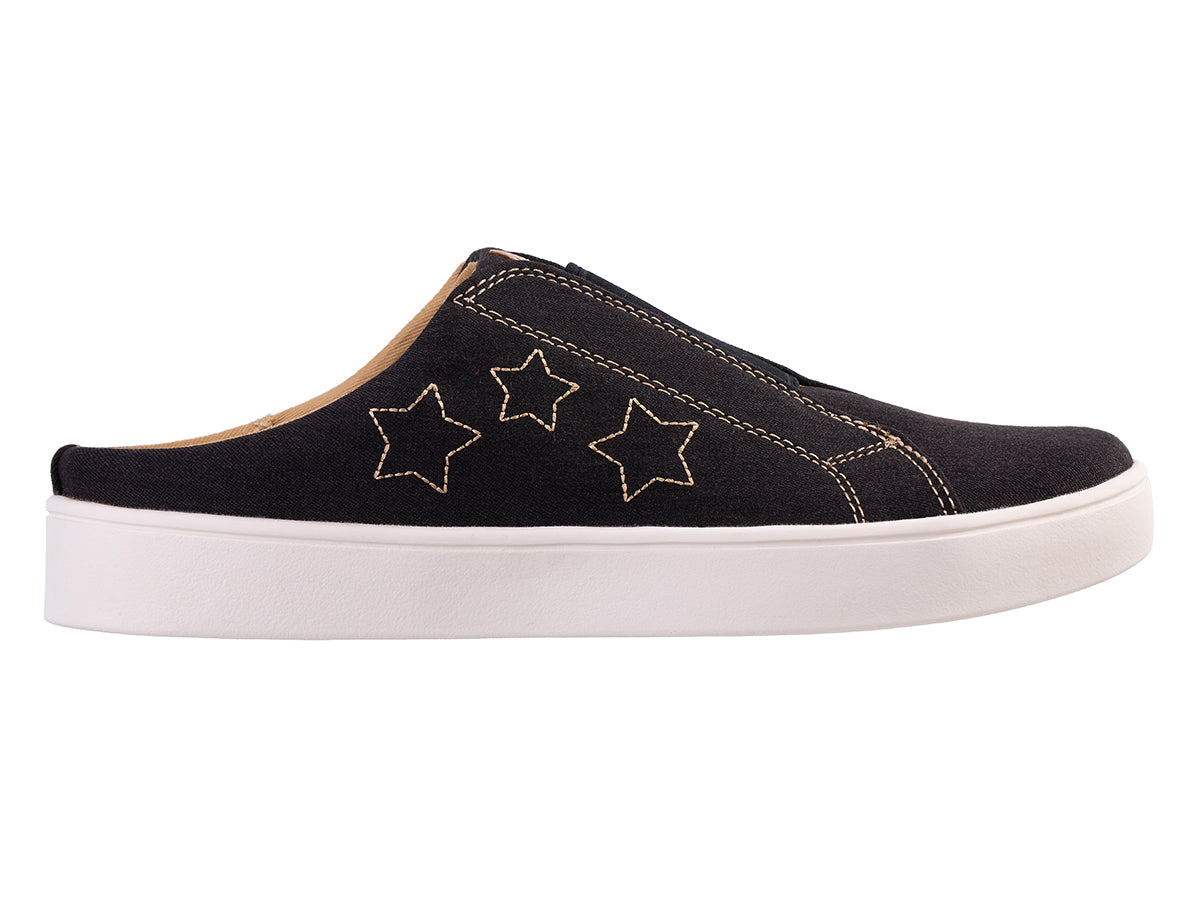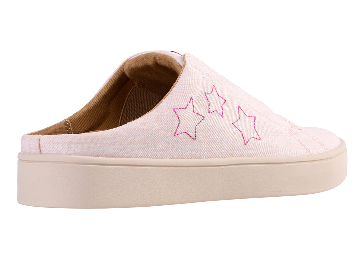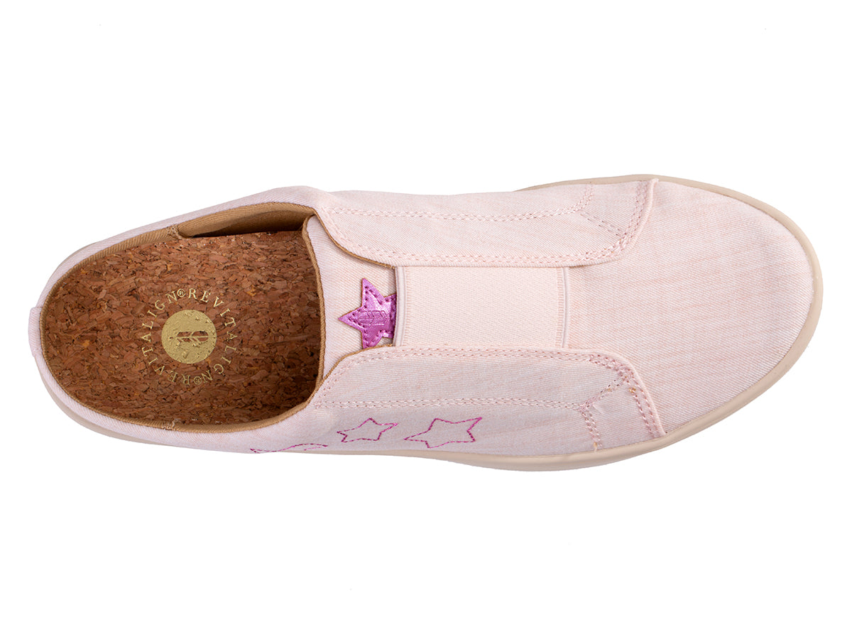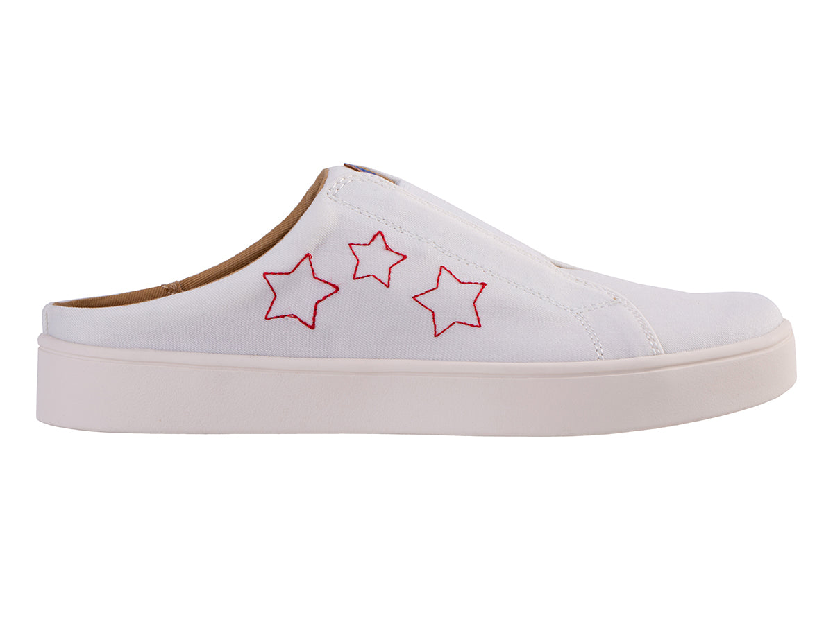 Embark on your next adventure and arrive feeling refreshed with the Harmony Slide. Experience support and Americana charm in this laid-back style. Featuring a natural twilled textile adorned with metallic stars, the Harmony Slide seamlessly blends function and fashion. Enjoy unmatched orthotic comfort and support with Revitalign® Footwear and our Full Contact Comfort® footbed, featuring a metatarsal dome, deep heel cup, forefoot cushioning, and anatomically designed arch support.