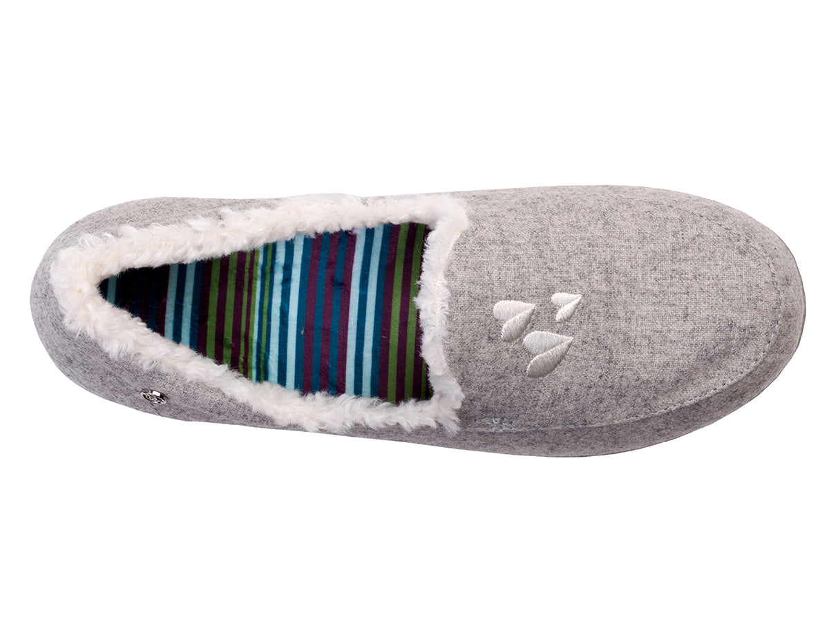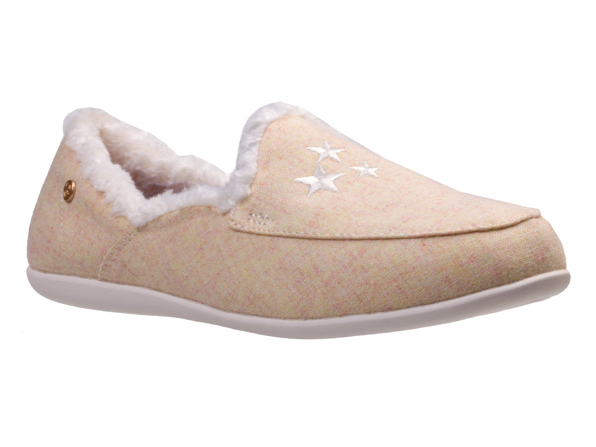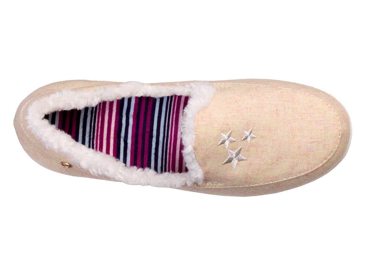 Walk amongst the clouds and rest your tired feet with our most errand-friendly outsole and our Full Contact Comfort® Footbed, experience all-day comfort and support with lightweight heathered textile beautifully embroidered with hearts or stars, faux fur lining, and stripe brushed jersey lined footbed.