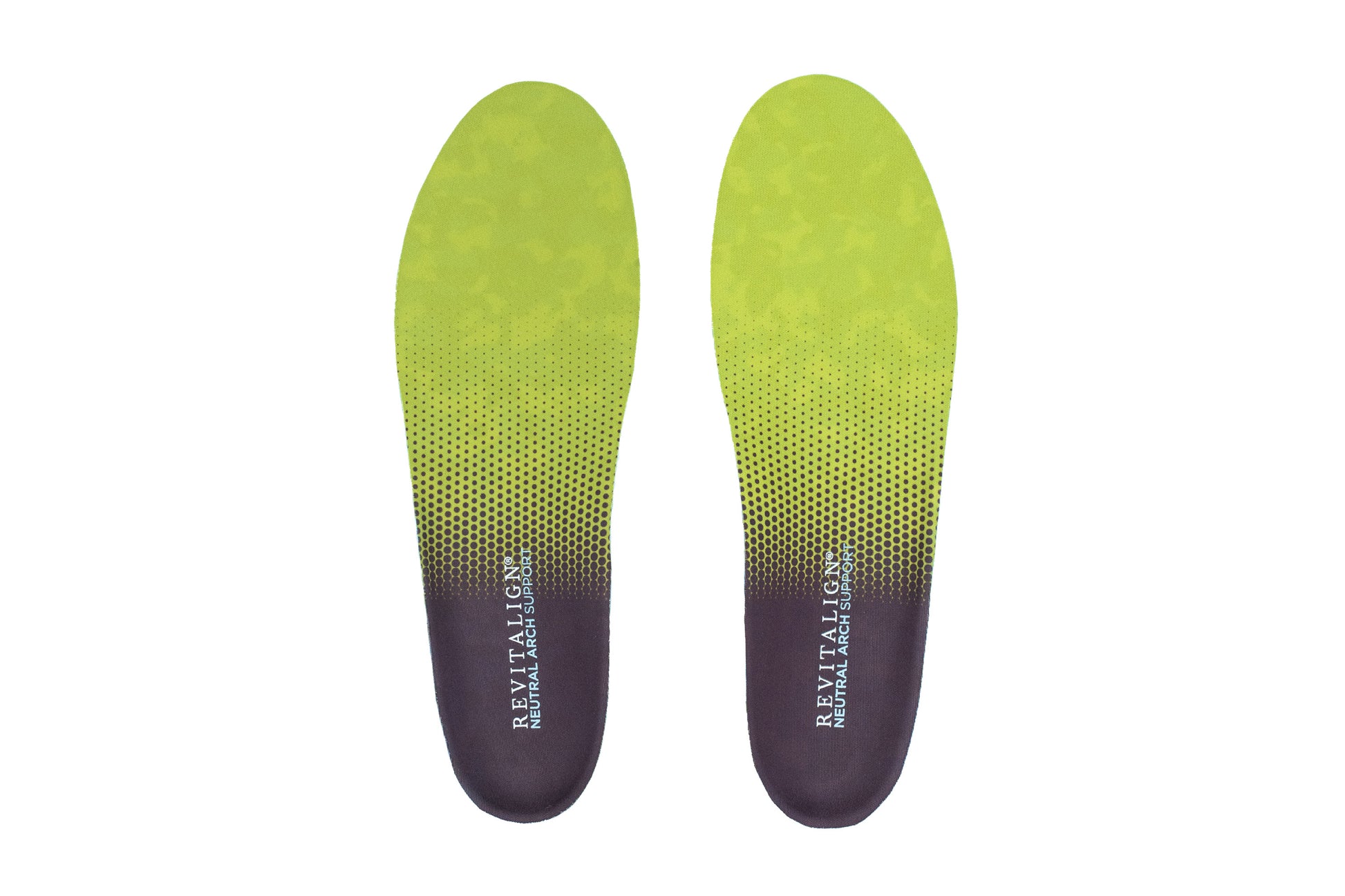 Fine-tune your level of arch support with REVITALIGN. NEUTRAL ARCH SUPPORT insole featuring Full Contact Comfort® is ideal for anyone looking for additional underfoot support and flexibility through a contoured replacement footbed. Find relief with our patented 360°Heel Cup which provides impact protection and cushioning upon heel strike, PWR BRIDGE™ integrated midfoot structure to support and stabilize a neutral arch, and targeted FLEXALIGN™ is formulated to provide long-lasting shock absorption and energy return.