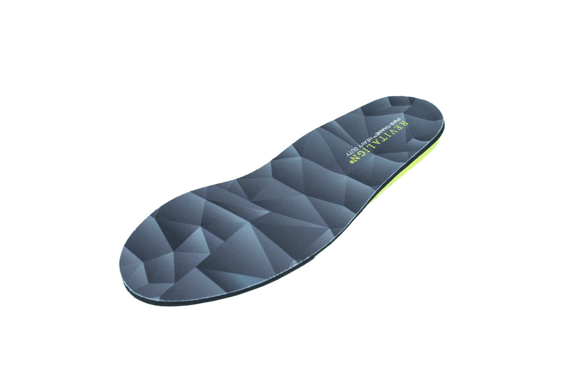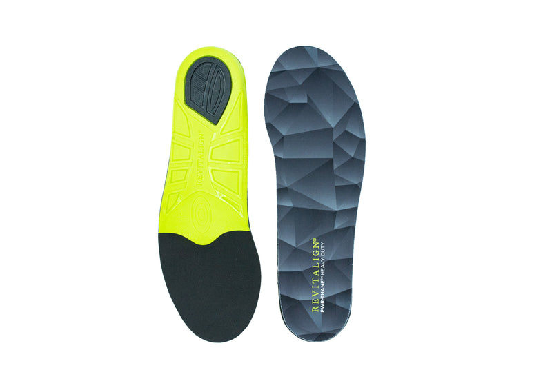 Help alleviate foot fatigue and injury with PWR-THANE™ HEAVY DUTY insole. Featuring Full Contact Comfort® from REVITALIGN, our ergonomically aligned insole is ideal for those hard at work and on their feet all day. Find relief through our 360° Heel Cup which provides impact protection and cushioning upon heel strike, PWR BRIDGE™ integrated midfoot structure to support and stabilize, and FLEXALIGN™ is formulated to provide shock absorption and energy return while targeting all foot types and Plantar Fasciitis sufferers.