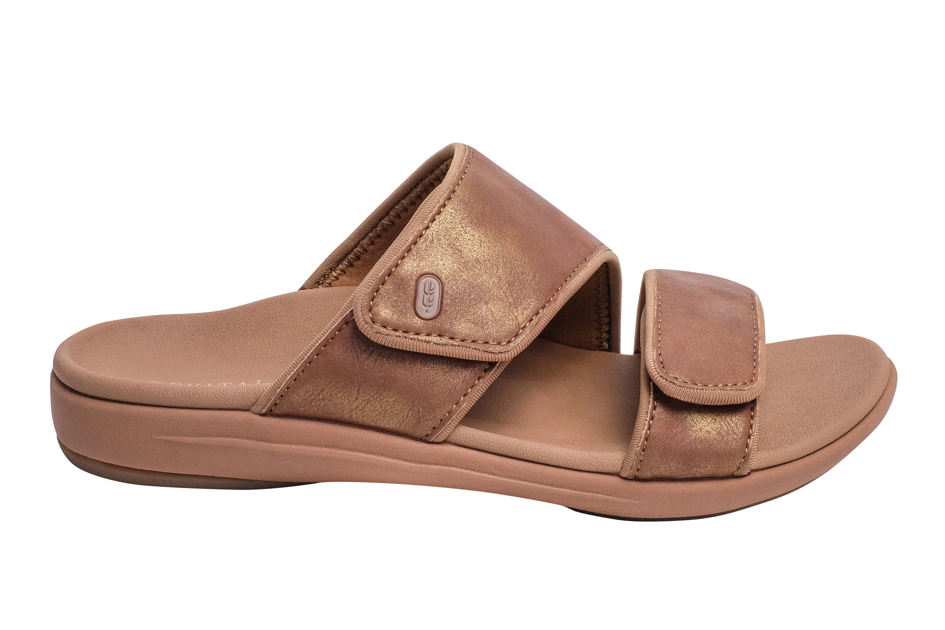 Add a touch of glamour to your everyday style with the Kholo Nuevo Metallic sandal. This easy-to-wear, low-heel sandal features a gorgeous metallic, leather-like upper paired with soft textile linings, ensuring you can move freely from workday to weekend. Enjoy a customized fit with fully adjustable straps, and find your perfect size with medium and wide options (6-12). Experience unmatched orthotic support with Revitalign® Footwear and our Full Contact Comfort® footbed, featuring a metatarsal dome, deep heel cup, forefoot cushioning, and anatomically designed arch support.
