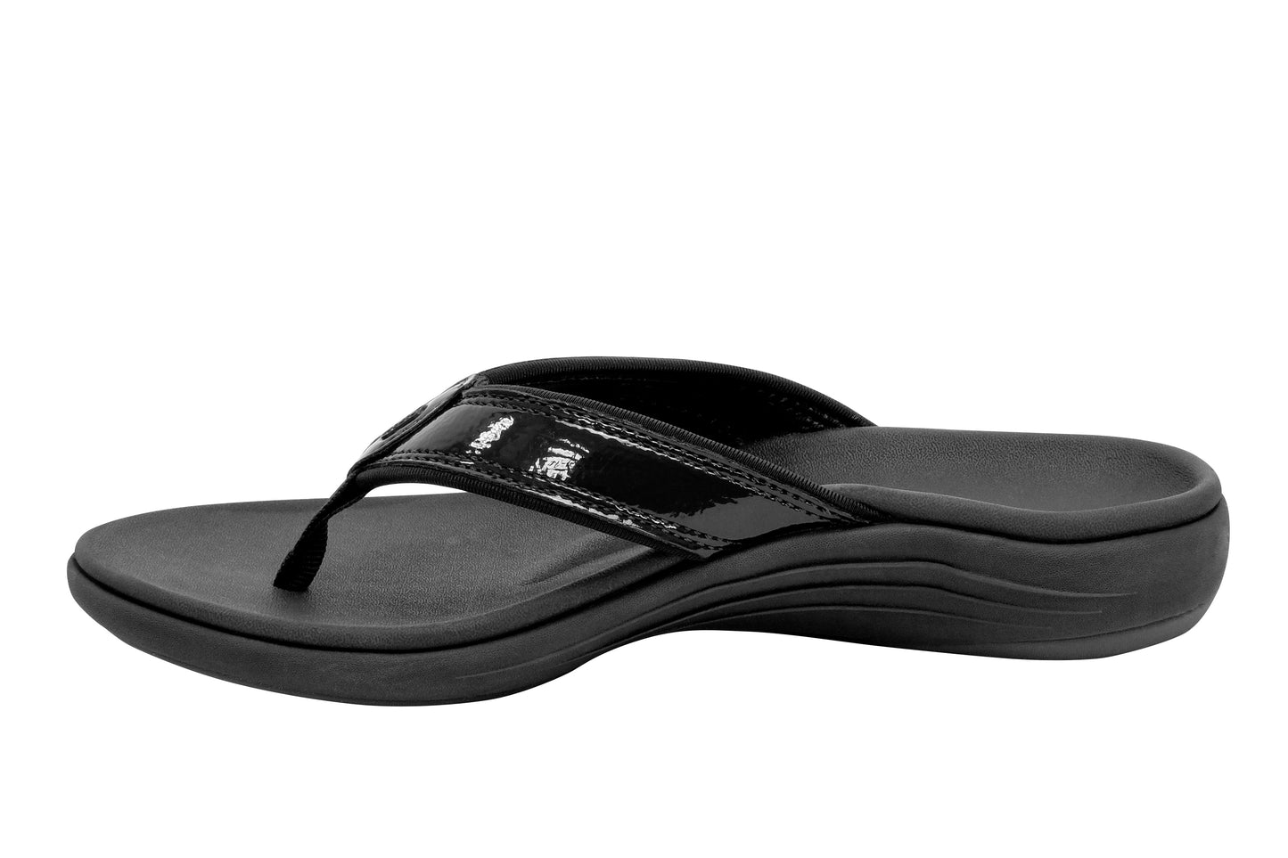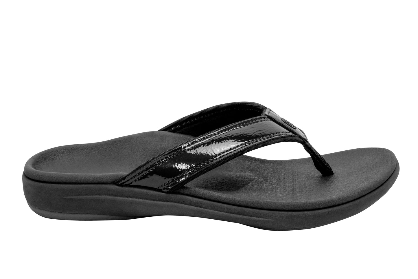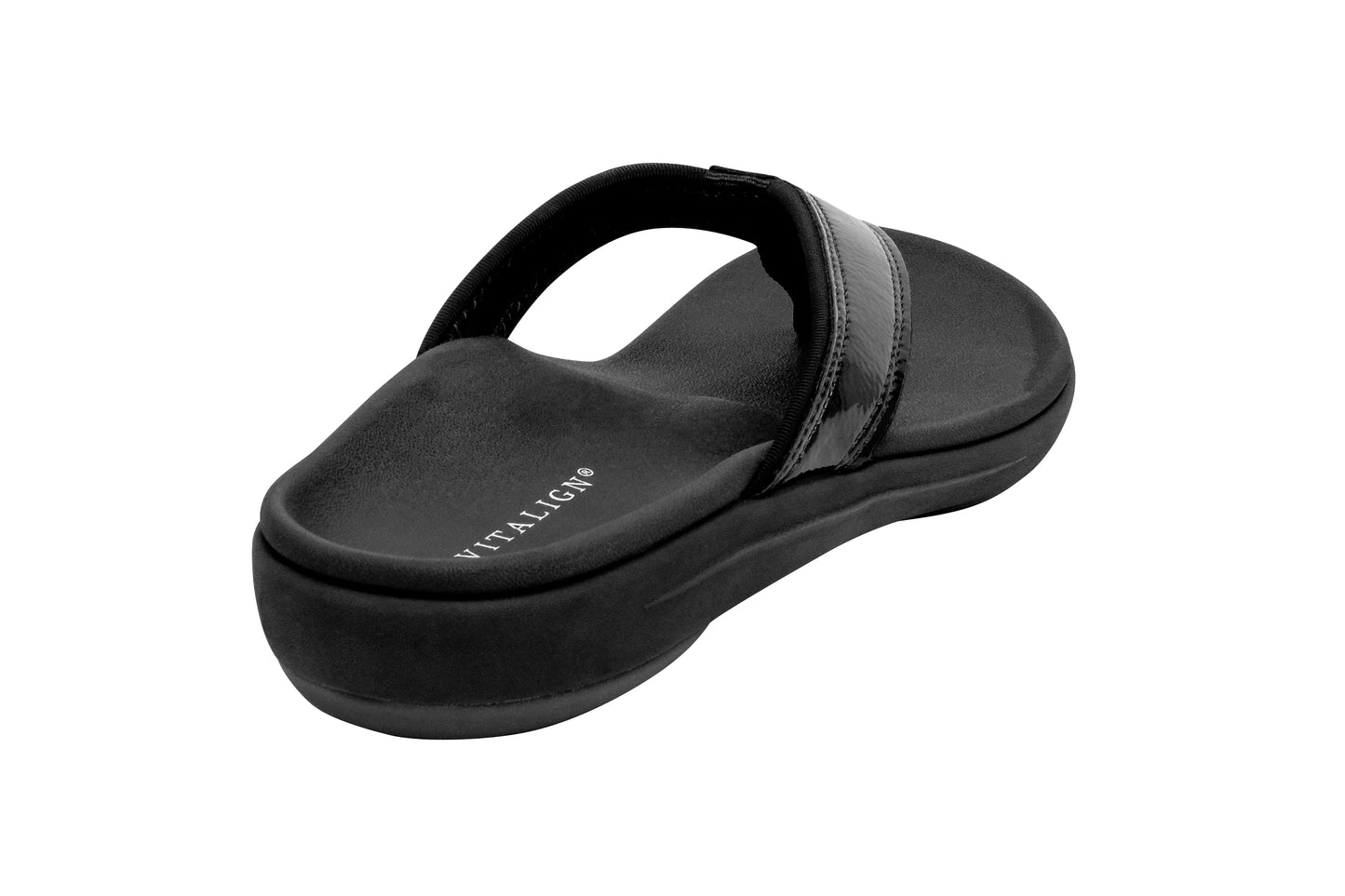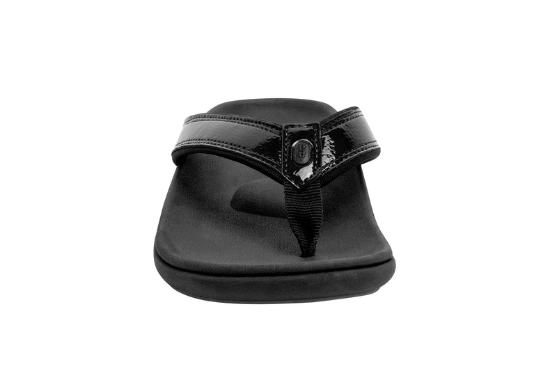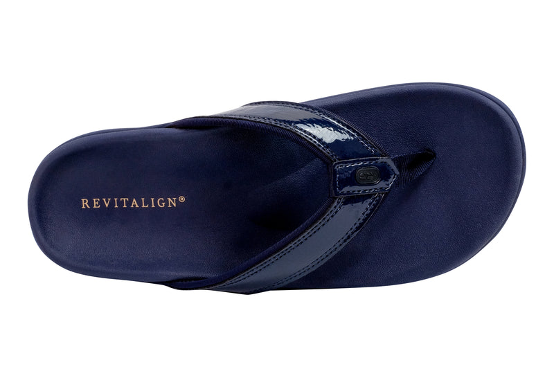 Experience the perfect blend of style and comfort with the Yumi Nuevo Flip, a sandal that proves you don't have to compromise on either. This flip-flop features a chic patent leather-like finish, beach-friendly quick-dry textile linings, and is available in both medium and wide widths (sizes 6-12). Step into unparalleled orthotic support with the Revitalign® Full Contact Comfort® footbed.