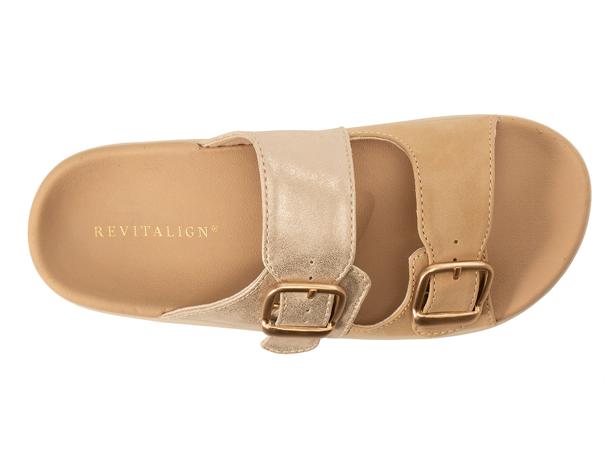 Every day should feel like a vacation. With a mix of shiny and matte finishes and tortoiseshell buckles, the Pensacola adjustable sandal brings effortless coastal style to your everyday wardrobe. This sophisticated slide is the perfect blend of high-fashion detailing and clinical functionality. Built with Revitalign® technology, it provides the substantial orthotic base needed to alleviate Plantar Fasciitis pain, ensuring you move freely and comfortably from morning to night.