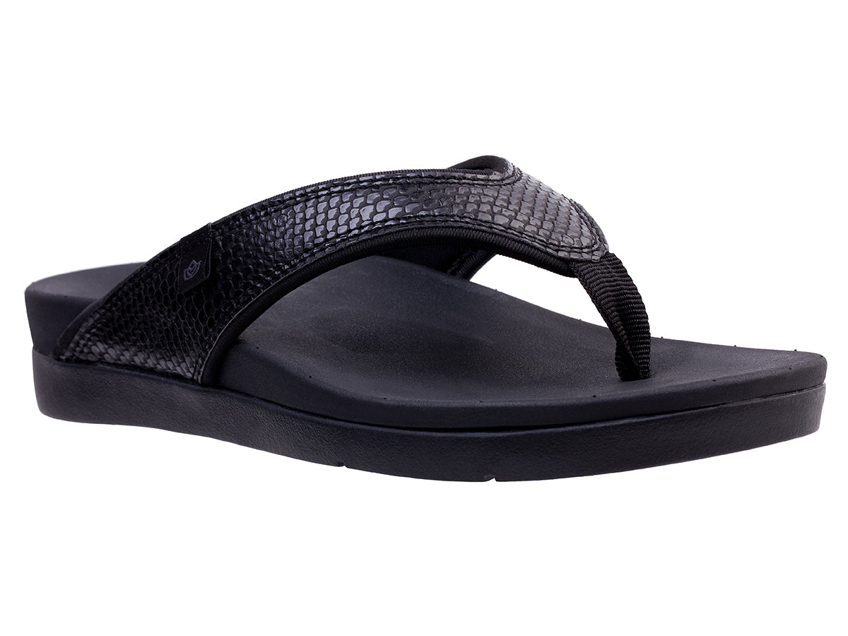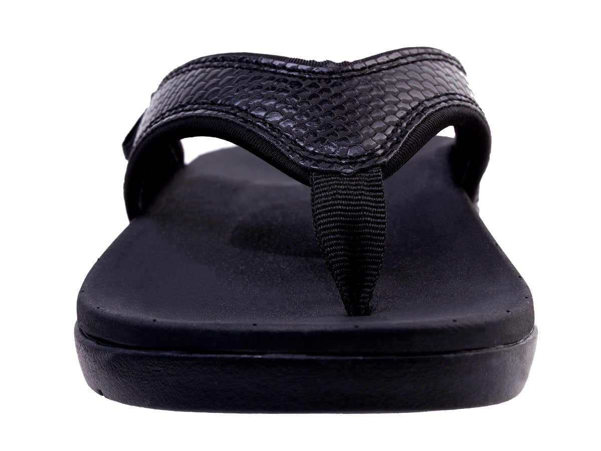 East or west, a shoreline never disappoints and with neither function nor fashion taking the back seat, the Shoreline Snake is no exception. Combining textured beach-friendly synthetic leather, a webbing toe-post, quick-dry linings, and an unlined footbed, make a statement this season by adding effortless flare to your attire. Our Full Contact Comfort® footbed provides an unmatched level of comfort and support.
